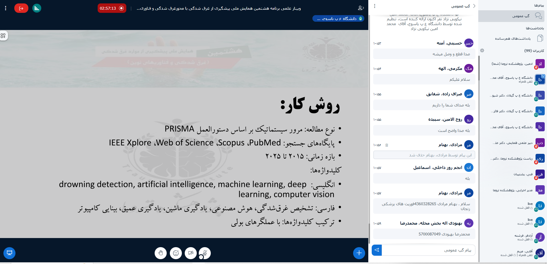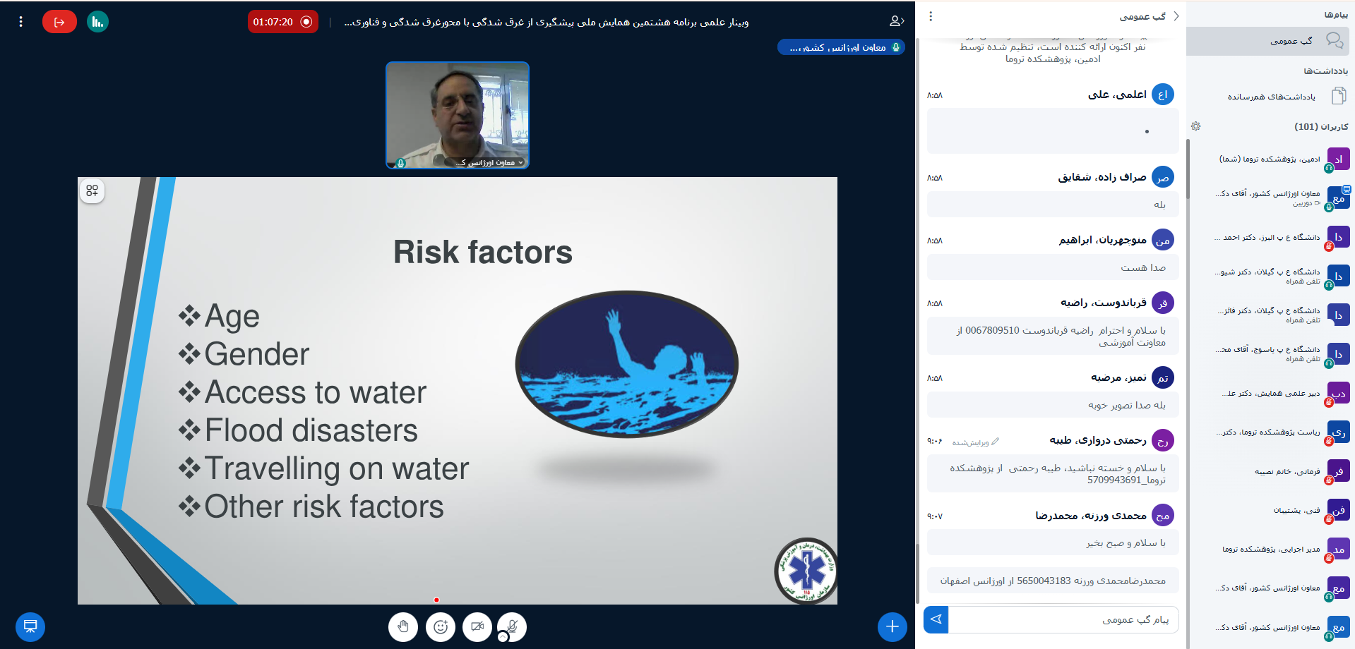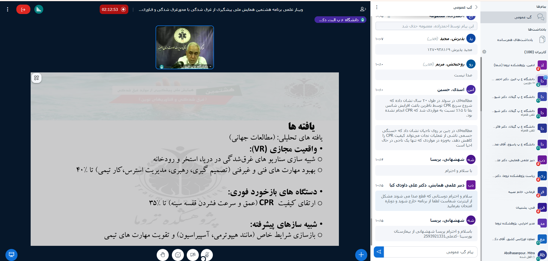 در ادامه دکتر شاهرخ یوسف زاده چابک در خصوص سیاست های اجرایی پژوهشکده تروما صحبت نمودند و هم چنین سخنرانان پیرامون اهداف اختصاصی برنامه و بررسی جزییات پیشگیری از موارد غرق شدگی و مباحث مرتبط را ارائه نموده که آقای دکتر حسن نوری ساری با عنوان کاربرد تله مدیسین و هوش مصنوعی در مدیریت بیماران دچار غرق شدگی و دکتر احمد مهد و ی دانشگاه علوم پزشکی البرز با عنوان کاربرد فناوری های نوین در آموزش احیای قلبی به پرسنل اورژانس پیش بیمارستان ی در غرق شدگی (مروری سیستماتیک بر پژوهش های ایران وجهان) و محمدامین نیکویی نژاد دانشگاه علوم پزشکی یاسوج با عنوان سیستمهای هوشمند تشخیص غر ق شدگی با ابزارهای هوش مصنوعی(یک مطالعه مرور سیستماتیک) ودکتر شیوا مهدو ی دانشگاه علوم پزشکی گیلان با عنوان مروری بر پیشگیری و مدیریت غرق شدگی( با تأکید بر فناور یهای نوین )وفائزه کبرائی ابکناردانشگاه علوم پزشکی گیلا ن باکاربرد اپلیکیشن های موبایل در مدیریت درمان بیماران غرق شدگی و نصیبه فرمانی با عنوانInvestigating the effect of a theory-based educational intervention using modern technologies in promoting drowning prevention behaviors in a sample of Iranian male high school students و در پایان دکتر علی داودی کیاکلایه با عنوان کاربرد GPS ها در پیشگیری از موارد غرق شدگی سخنرانی کردند و با پرسش و پاسخ شرکت کنندگان برنامه مذکور پایان یافت.