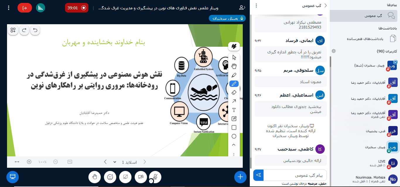 در ادامه سخنرانان پیرامون  اهداف اختصاصی برنامه  و بررسی جزییات پیشگیری از موارد  غرق شدگی و مباحث مرتبط با گروه های  هدف متخصص طب اورژانس متخصص پزشکی اجتماعی متخصص اطفال متخصص بیهوشی و پزشکان عمومی- پرستاران  و ماما ها صحبت نموده که  خانم دکتر زهرا محتشم امیری   (بورد تخصصی پزشکی اجتماعی/ استاد د.ع .پ.گیلان)با عنوان تجربیات موفق کشورهای مختلف در حوزه نقش فناوری های نوین در پیشگیری از موارد غرق شدگی ، دکتر حمیدرضا آقابابائیان دکتری تخصصی  سلامت در حوادث و بلایا / استادیار د.ع .پ.دزفول)با عنوان نقش هوش مصنوعی در پیشگیری از غرق شدگی در رودخانه ها: مروری  روایتی بر راهکارهای نوین و خانم دکتر پرند پورقانع   (دکتری تخصصی آموزش پرستاری/ دانشیار د.ع .پ.گیلان)با عنوان کاربرد پهباد نجات غریق مجهز به سیستم پزشکی از راه دور در پزشکی و مدیریت حوادث غرق شدگی و دکتر علی داودی کیاکلایه( دکتری تخصصی پزشکی اجتماعی/ استادیارد.ع .پ.گیلان)با عنوان کاربرد   GPSها در پیشگیری از موارد غرق شدگی سخنرانی کردند و با شرکت کنندگان به تبادل نظر پرداختند.