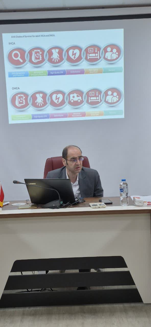در ادامه سخنرانان پیرامون اهداف اختصاصی برنامه و آشنایی با آموزش احیای قلبی ریوی پایه و مباحث مرتبط با گروه های هدف متخصصین گروه های مختلف – پزشکان عمومی- پرستاران و فوریت های پزشکی صحبت نموده که خانم دکتر نازنین نوری ( متخصص طب اورژانس / استادیار د. ع پ. گیلان)با عنوان آشنایی با احیای قلبی -ریوی پایه بزرگسالان و در ادامه دکترسید مهدی ضیا ضیابری- متخصص طب اورژانس- دانشیاردانشگاه علوم پزشکی گیلان با عنوان آشنایی با اصول کلی مدیریت راه هوایی در احیای قلبی- ریوی پایه بیماران ترومایی و دکتر رضا صفایی- متخصص طب اورژانس با عنوان آشنایی با احیای قلبی- ریوی پایه کودکان و دکتر محمدمحسنی - متخصص طب اورژانس- استایاردانشگاه علوم پزشکی گیلان با عنوان آشنایی با اصول کلی برخورد با ارست قلبی- تنفسی در بیماران ترومایی واحیای قلبی ریوی پایه در شرایط خاص صحبت کردند و با شرکت کنندگان به تبادل نظر پرداختند.